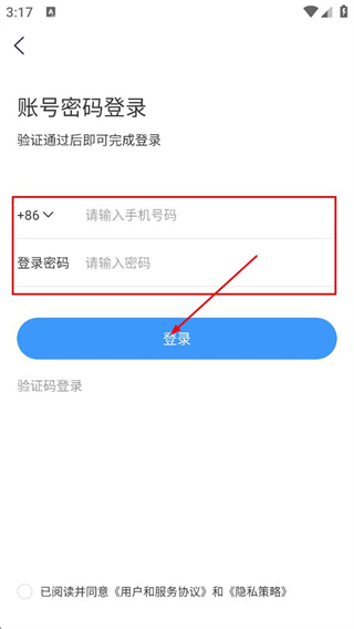 4、在账号密码登录页,填写手机号码和密码后,点击登录。