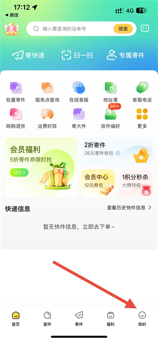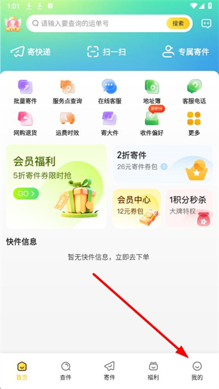 1、进入韵达快递app,点击底部我的选项,进入个人中心页面。