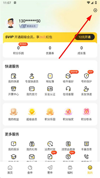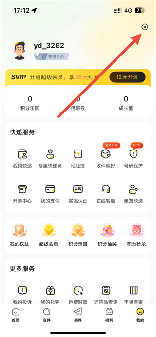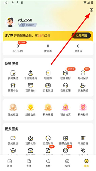 1、打开韵达快递APP后,在我的界面找到右上角设置选项并点击。