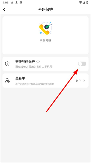 4、在号码保护页面,找到寄件号码保护对应的开关按钮,点击将其切换为开启状态,即可启用该功能。