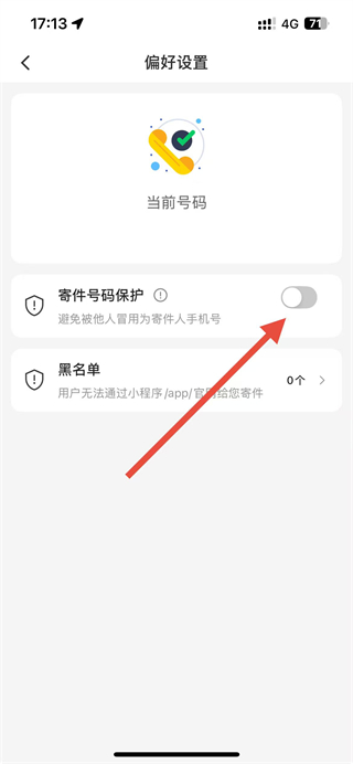 4、在偏好设置页面,点击寄件号码保护右侧的开关按钮,开启该功能即可。