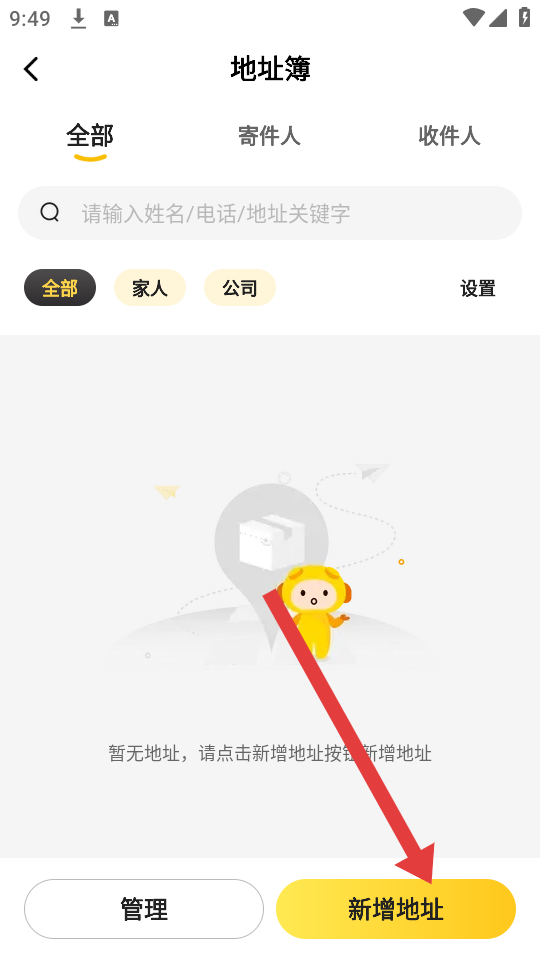 1、打开韵达快递APP,进入我的页面,找到并点击地址簿的选项,进入地址管理的界面。