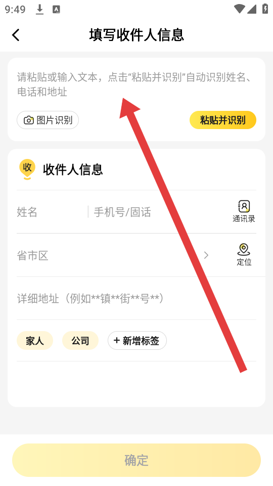 3、填写新的收件人信息如姓名、手机号、省市区、详细地址等,也可以选择复制黏贴,确认无误后点击确定保存。