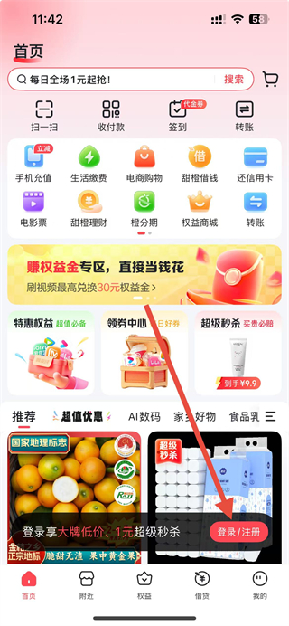 1、进入翼支付app,点击页面底部的登录注册按钮,触发登录相关的操作弹窗。