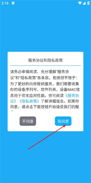 1、在使用协议隐私政策弹窗中点击我同意按钮,进入登录页面。