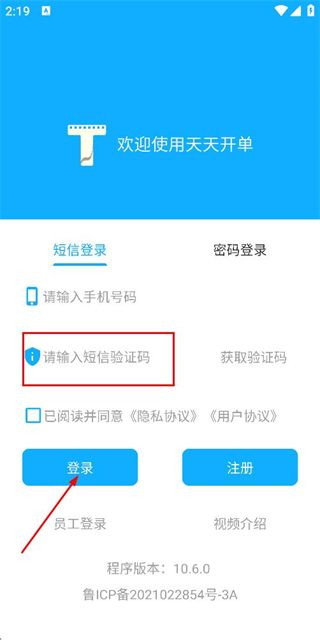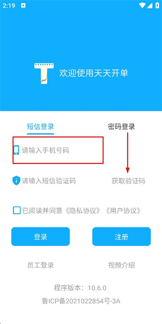 2、在登录页面填写手机号,勾选协议后,点击获取验证码。