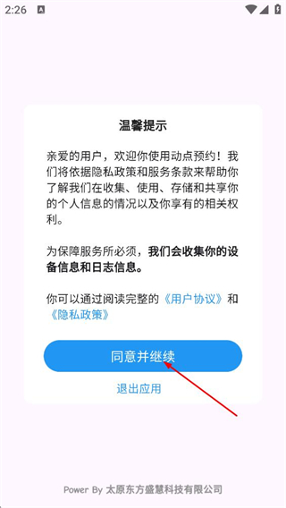 1、在动点预约温馨提示页,阅读后,点击同意并继续按钮。