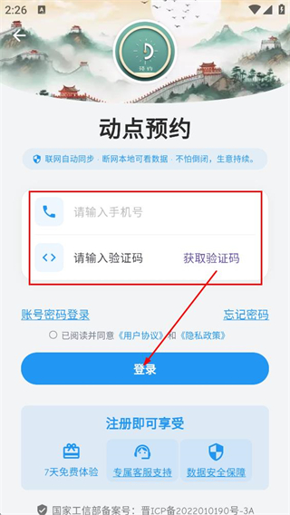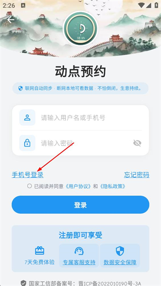 2、在动点预约登录页,点击手机号登录选项,切换登录方式。