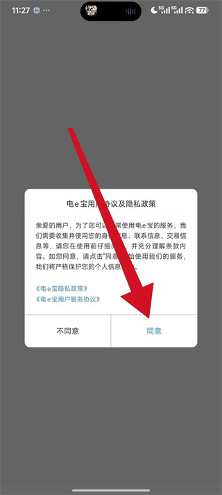 1、打开电e宝,在弹窗中点击同意,进入首页。