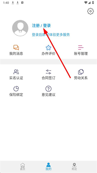 2、在我的界面中,找到注册登录区域并点击,进入登录相关的操作页面。