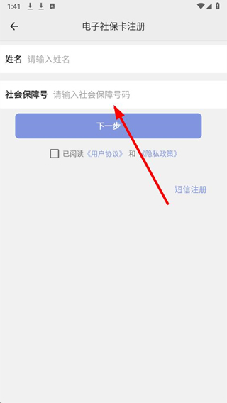 4、在注册界面输入姓名、社会保障号,勾选协议后点击下一步,后续按提示完成注册操作。