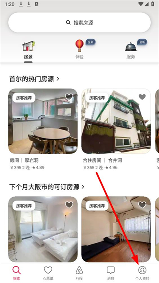 1、打开爱彼迎APP后,点击界面底部的个人资料选项,进入个人界面。