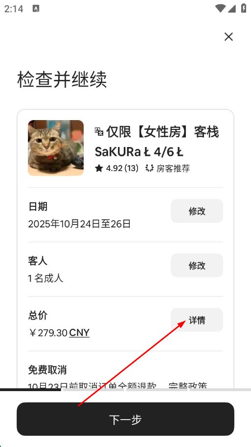 3、在订单信息确认页面,查看预订的日期、入住人数等信息,点击总价旁边的详情按钮。