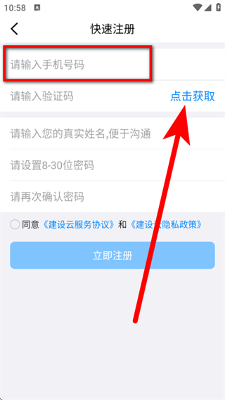 3、在快速注册页面,输入手机号码,点击获取验证码。