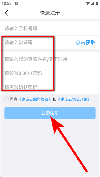4、输入验证码,设置密码,勾选同意相关协议后,点击立即注册,完成账号注册。