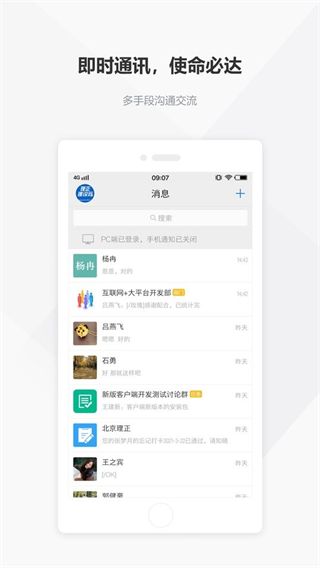 4、支持多终端登录使用,聊天记录、文件资源、任务进度实时同步,员工可随时随地开展沟通协作,适配多元办公场景,办公不受地点限制。