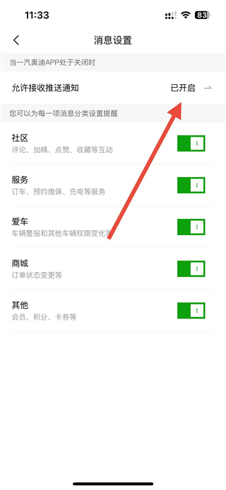 4、在消息设置界面,可关闭允许接收推送通知总开关,或单独关闭社区、服务等分类消息的开关。
