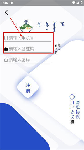 2、在注册页,填写请输入手机号,点击发送验证码后填写请输入验证码。