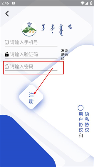 3、填写请输入密码,勾选用户协议和隐私协议后,点击注册按钮,完成注册。