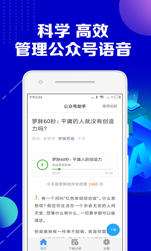 公众号助手app是一款直接管理公众号,包括订阅号、服务号等平台的管理软件,支持随时随地在线进行管理,查阅内容,实现用户和资源实时互动,帮助公众号更好的惊喜推广,更快进行营销,使用起来简单易上手,需要的用户快来下载使用吧。