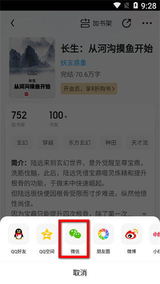 2、在书籍详情页面,点击分享图标,弹出分享选项列表。