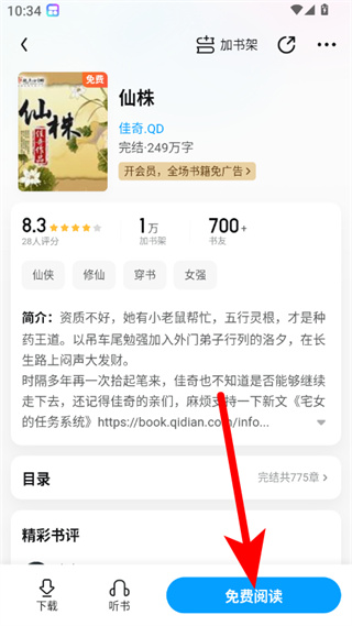 2、在书籍详情页,点击免费阅读,进入书籍阅读界面。