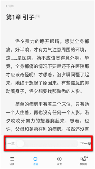 4、在进度调节栏,拖动滑块即可调整阅读进度。