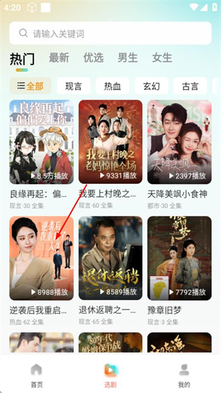 1、在七柚剧场首页点击选剧选项,进入剧集列表页面。