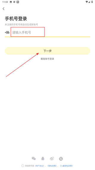 2、进入手机号登录的页面内,输入手机号后点击下一步。