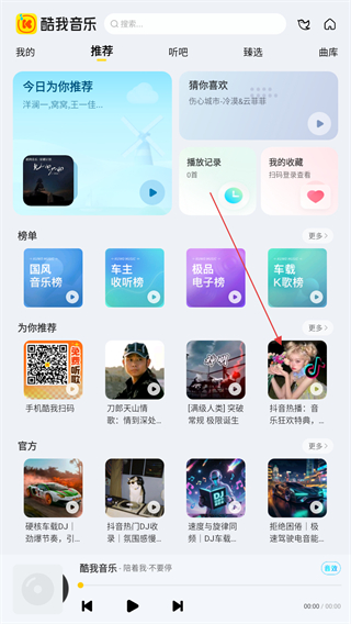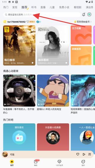 1、打开酷我音乐APP,点击页面顶部的搜索栏。