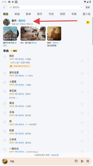 3、在搜索结果中,找到歌手的个人主页入口,点击进入。
