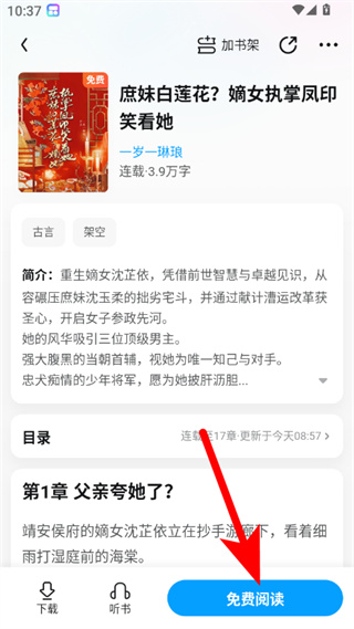 2、在书籍详情页,点击免费阅读按钮,进入阅读界面。
