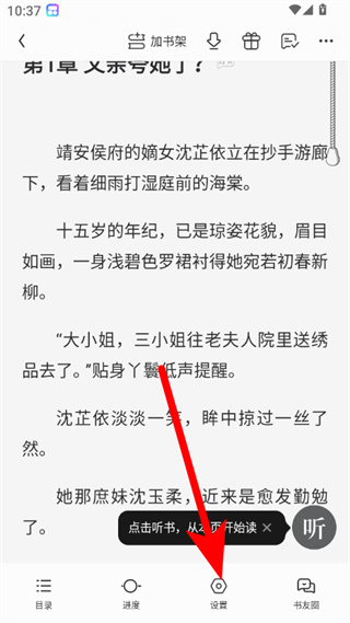 3、在阅读界面,点击下方设置选项,弹出设置菜单。
