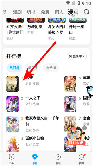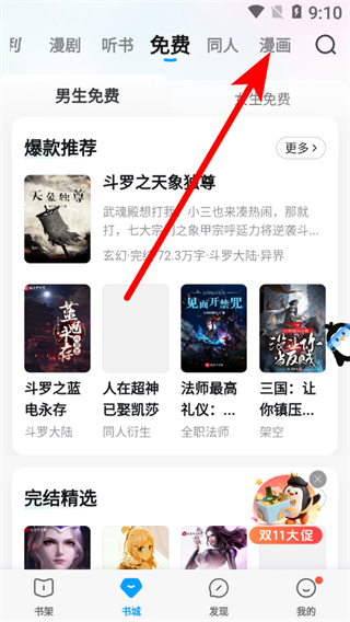 1、在QQ阅读书城页面,点击漫画选项,进入漫画频道。