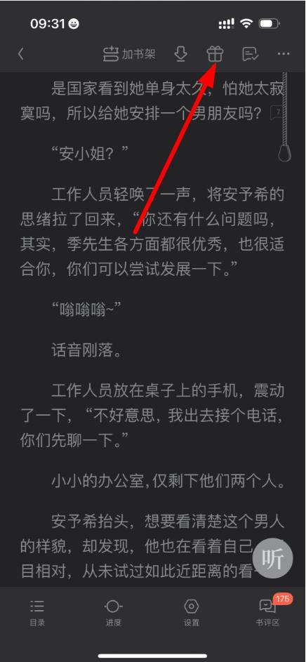 2、在小说阅读界面点击上方功能区,找到并点击类似“礼物”图标进入打赏或赠礼界面。