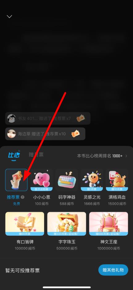 3、在打赏界面中找到月票相关图标如带有月票标识的礼物,若有可投月票,点击对应图标,按提示完成投月票操作。