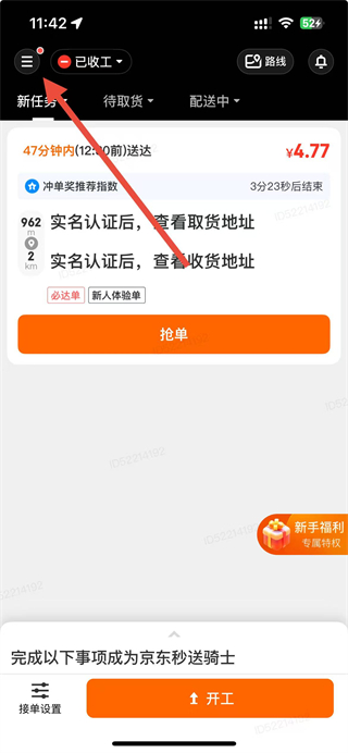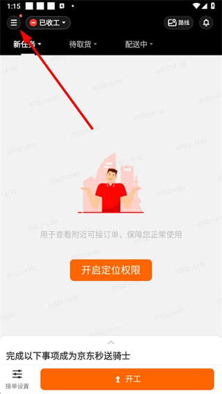 1、打开京东秒送骑士后,点击左上角的菜单按钮,展开功能选项。