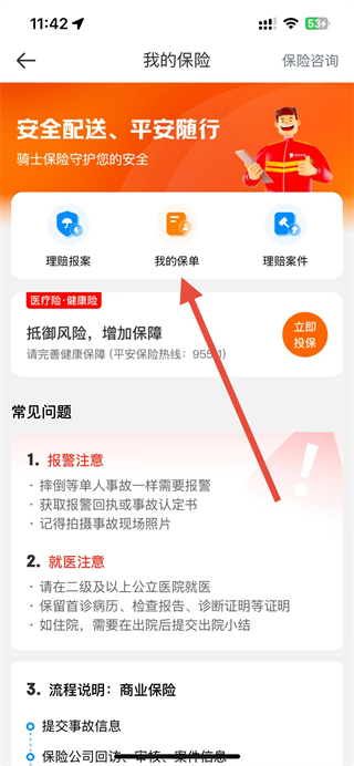 2、在个人页面点击我的保险选项,进入我的保险页面。