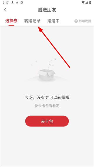 4、在赠送朋友页面,点击顶部的转赠记录标签,即可查看赠券记录。