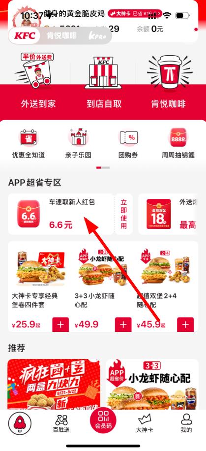 1、打开肯德基应用在首页APP超省专区找到车速取新人红包6.6元活动入口并点击。