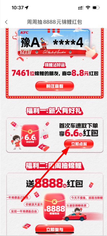 2、进入周周抽8888元锦鲤红包活动页面,找到福利一:新人有好礼板块,点击立即点餐按钮。