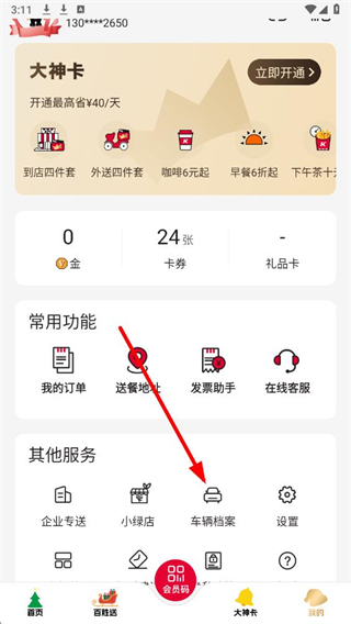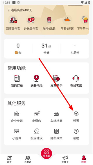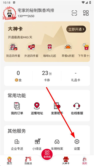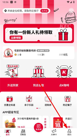 1、打开肯德基app,点击底部导航栏我的,在大神卡板块下方找到“早餐6折起”图标,点击进入早餐页面。