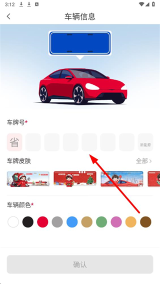4、在车辆信息页面,填写车牌号、选择车牌皮肤和车辆颜色后,点击确认即可完成车辆信息添加。