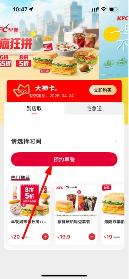 2、在早餐页面中,选择到店取或宅急送服务,然后点击预约早餐按钮。