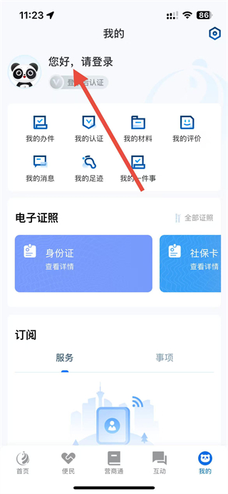 1、打开天府通办app,点击我的页面中登录区域,进入登录界面。