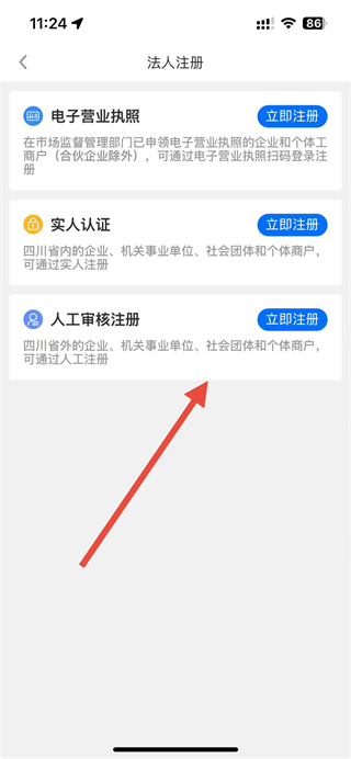4、在法人注册页面,选择对应注册方式,点击立即注册按提示完成流程。
