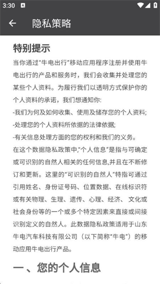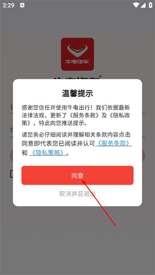 1、使用牛电出行时,查看温馨提示并阅读服务条款,点击同意。