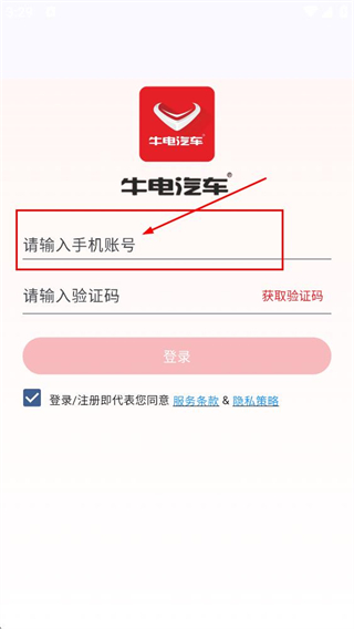 2、进入牛电汽车登录页,在请输入手机账号输入框填写信息。
