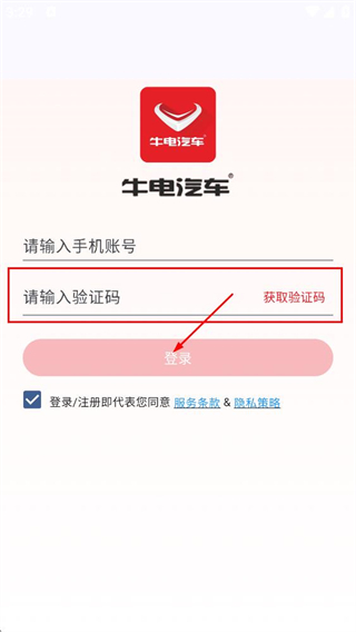 3、在牛电汽车登录页,输入验证码,点击登录,完成登录操作。