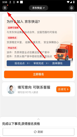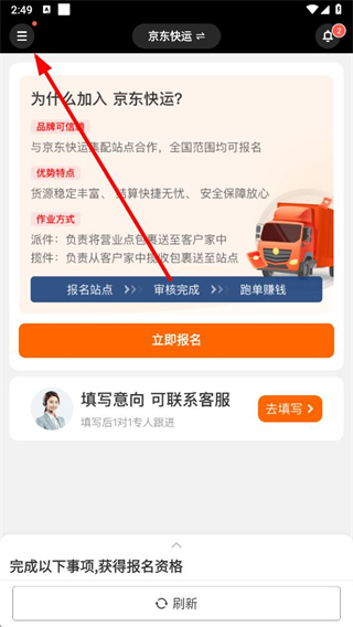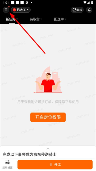 1、打开京东秒送骑士app,点击界面左上角的菜单按钮,进入功能页面。